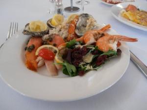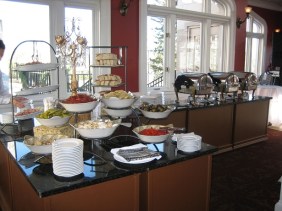 ブランチで、一人$35+Taxだが、殻つきの生牡蠣、はまぐり、かに、えび、スモークサーモンなどのアペタイザー から、暖かいメインディシュの数々、 カービングやオムレツスタンドが並び、大人気です。デザートもケーキやプリン、ゼリー、果物などが綺麗に飾られ食欲をそそられます。ブランチは日曜日