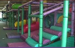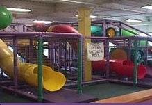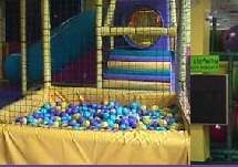 入り口のドアを開けるとすぐ左側に 受付及びスーパーバイザーのカウンターがあり、右側には60人まで収容できるパーティールーム、その正面には カラフルなジャングルジムが備わり、 なかに滑り台、トンネル、ボールで