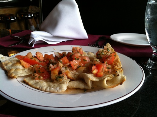 席に着くと直ぐにお水とパンとアミューズ(付きだし)に薄焼きピッザの生地にビネガーとバジルで 和えたトマトがのったものが出され、それをつまみながらメニューを決めました。
