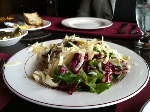サラダはアルギュラとエンダイブの上にスライスされた パラメジャンチーズがのっていて、バルサミコビネガーと オリーブオイルのドレッシングが絶妙で食がすすみます。