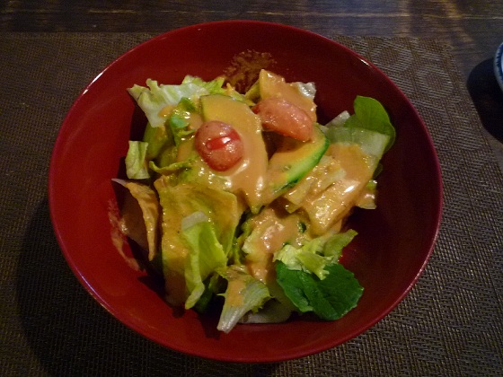 さっそくビーフとエビ天ぷら、チキンとエビ天ぷら、刺身とエビ天ぷらの Combo をオーダーしてみました。大きめの器にたっぷりとサラダがもられ、どことなく懐かしいGinger Dressing に食をそそられます。ビーフは鉄板で 焼かれているせいか、ミディアムに上手く焼かれ、柔らかな肉質とジューシーな味わいで、うわさどおりの美味しさでした。
