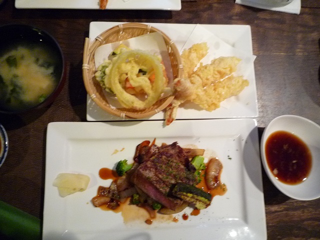 天ぷらはエビ3本に南瓜、ズキニー、ブロッコリ、タマネギとボリューム満天です。 チキンも照り焼きソースと良く馴染み美味しかったです。お刺身は新鮮で鮪、ハマチ、サーモンの3点盛り、ビーフもチキンもメインディシュとしても通用するぐらいの