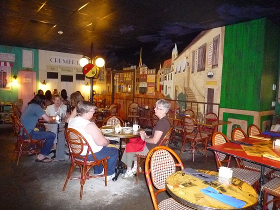 です。四方の壁にはパリの街路風景がいっぱいに描かれ、店内の真ん中には街灯まで立ち、古風で 趣きがあるパリの街角カフェの雰囲気を演出して います。