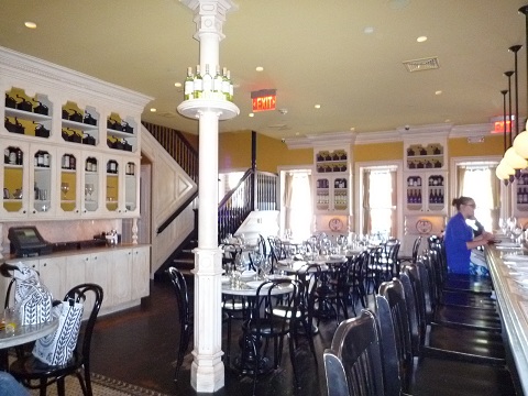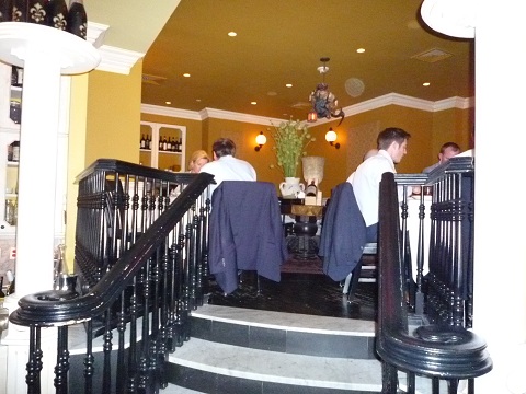 この建物は昔小さなホテル (Bed & Breakfast ) だったそうで、外観は普通のビルですが、ドアを開けると重厚な雰囲気が漂っています。大部屋、小部屋を上手にアレンジしてあるので、テーブル数も多く、2階にも同じぐらいの数のテーブルがあるので、大家族が揃ってのディナーも問題なしです。また、1階には大きなバーカウンターも あり、内装は白を基調に上品でスタイリッシュな趣があります。