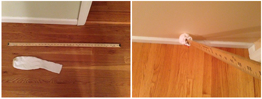 長い棒(ものさしなど)の先に、ご主人の不要な綿の靴下やタオルなどを丸くして付けますが、中をしっかり入れて丸くし端を紐で結びます。これで床のモールディングのほこりなどを腰をかがめて掃除機をかけなくてすみます。掃除終了後、靴下は捨ててしまいます。