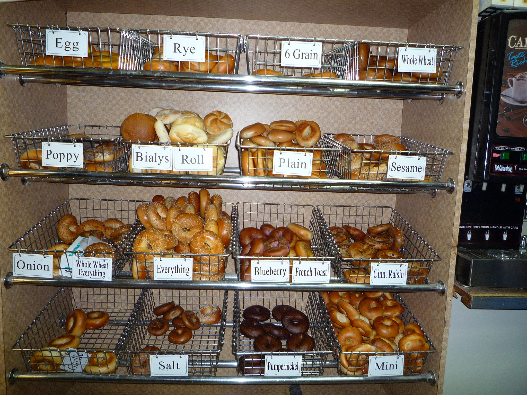 プレーンから白ゴマ、ガーリック、ケシの実等を上にまぶしたものや、シナモンレーズン、ブルーベリーを生地に混ぜ合わせたものや、ライ麦から作られたベーグルなど16種類と豊富です。