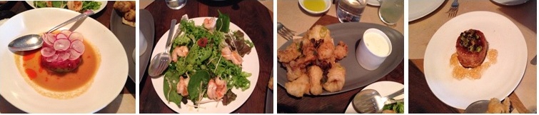私達は、アペタイザーにTuna Tartare, AvocadoW/Ginger sauce (ツナタルタル)、Gulf Shrimp Salad (シュリンプサラダ)、Cracking Calamari w/Yuzu Dipping Sauce(フライドカラマリ)、Foie Gras Terrine(フォアグラのテリーヌ)をオーダー しました。