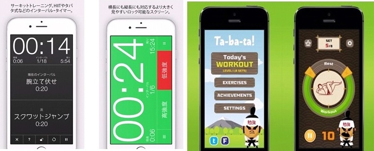 ジャックなどを交互に行うのでお金はかかりませんが、最近はiPhoneやiPadなどの アプリケーションも豊富でやる気を沸かせてくれます。特にお勧めが‘勉強’と書かれた鉢巻を頭に付けた海苔眉毛君が登場するアプリケーションで、始まる前に“ビギン!”、休憩時に“レスト!”と80年代流行った空手キッドのMr. ミヤギのような掛け声で4分間付き合ってくれますので、楽しくエクササイズ出来ます。