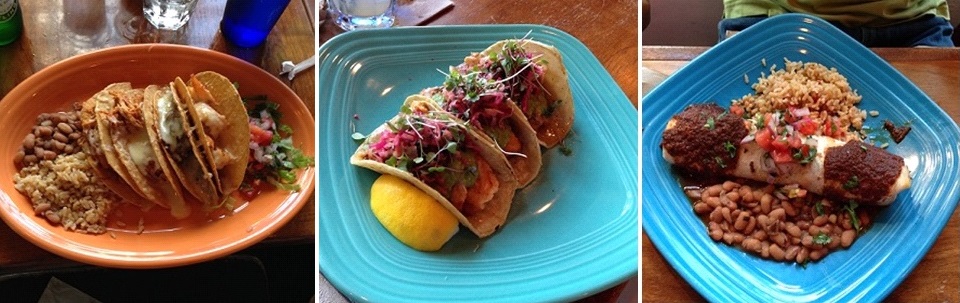 オーダーしました。Quatro Tacosは4つのクリスピーコーンタコスで、2つの Chicken tings と2つのPorkですが、追加で$1.払うとBeef に、$1.25払うとWild Caught Shrimpに変更してもらえるので、1つをShrimpにしました。それぞれTop にのせられたJack Cheddar Cheeseがとろけてチキンやポークと混じりとても美味しかったです。傍にはOrganic Spanish Brown RiceとPinto Beans が添えてありま すが、これらも味が濃すぎず素材の味を味わえます。