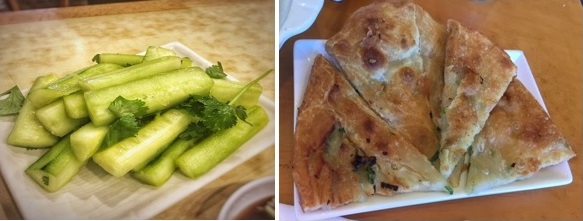 まず、前菜にCucumber & GarlicとScallion Pancakeを注文。Cucumber & Garlicはガーリックが効いており、キュウリがシャキシャキしており歯ごたえがありました。Scallion Pancakeはもちもちした食感でどちらも美味しかったです。