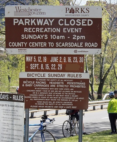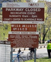 Bicycle Sunday と銘打って、Bronx River Parkway のExit 4 (Scarsdale Road)~Exit 22 (Westchester County Center)の間を車両通行止めにし、自転車やランニングのために開放しています。ただし、スケートボードと犬は駄目で、ローラースケート、モーターの無いスクター、乳母車は大丈夫です。