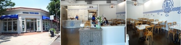 白とロイヤルブルーでまとめられた40席ほどのEat-inダインイングとTake-Outのカウンターがある店内は、清楚で広々としたと感じです。さっそくGreek Sandwiches on Pitaのメニューから定番のLamb & Beef GyroとChicken Gyro、それにBifteki SandwichとPork Souvlaki Sandwich をオーダーしました。