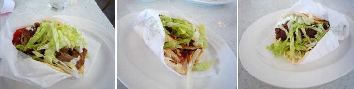 白とロイヤルブルーでまとめられた40席ほどのEat-inダインイングとTake-Outのカウンターがある店内は、清楚で広々としたと感じです。さっそくGreek Sandwiches on Pitaのメニューから定番のLamb & Beef GyroとChicken Gyro、それにBifteki SandwichとPork Souvlaki Sandwich をオーダーしました。