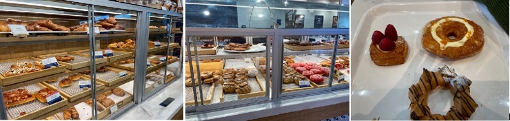 午前中はベーカリーの中のガラス張りで出来た部屋の中で、手作りケーキの飾りつけをしている様子を外から見ることが出来ます。ケーキ作りに魅せられ中に入ると右側には日本のベーカリーのようにトレーとトングがあり、並んいる種類豊富なパンを取る形式でどれにしたらよいか迷った挙句、沢山のパンを買ってしまうはめになるかもしれません。ドーナツ類はこちらのダンキンドーナツのメニューよりも日本のミスタードーナツに近く、こちらでは見ないポン・デ・リング(もちドーナツ)等日本人好みの品々も置いてありました。奥に進むとホールケーキとカットケーキのショーケース、コーヒーステーションと会計があります。