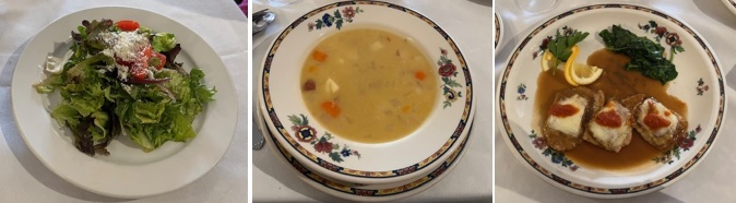 今回はサラダとスープ、メインはVeal Sorrento、仔牛を選びました。グリーンサラダはトマトが入り、オーセンティックなイタリアンドレッシングにパラメジャンチーズがかかり、ヘルシーな一品で美味しかったです。スープはレンティルスープ、刻んだベーコン、ポテトが入り、コクのある温まる一品でした。メインのVealは柔らかく、お肉の上にはモツェレラチーズとトマトソースのアクセントで全体のワインソースにとても合い、美味でした。今回はオーダーをしなかったのですが、以前頂いたバターが効いた、レモン風味の魚のメインも美味しかったです。
