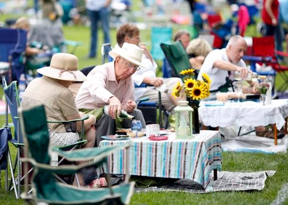 席があろうがなかろうが皆開場とともに芝生エリアへ直行します。それぞれ椅子やらクーラーボックスやら大荷物を持っています。まずはこの芝生エリアでゆっくりとワインなどを飲んで雰囲気を楽しむというのが一般的です。普通公共の公園などではお酒は飲んではいけませんが、有料の敷地内なので大丈夫です。テーブルに花を飾ってキャンドルをたいて、ワインボトルにワイングラスを並べている人なども。