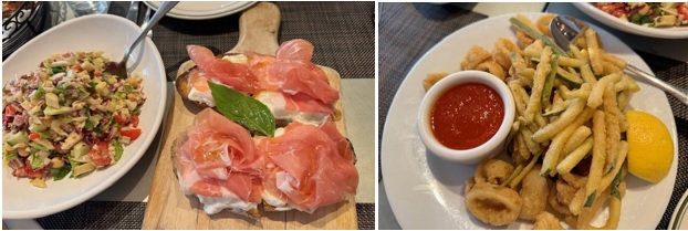 今回オーダーしたのは前回と同じイタリアンブレッドの上に生ハムとトロトロのチーズの上にトリュフハチミツをかけたCrostino、イカとズッキーニのフライ、そして新たにChopped Saladですが、Crostinoは是非試して頂きたい一品です。