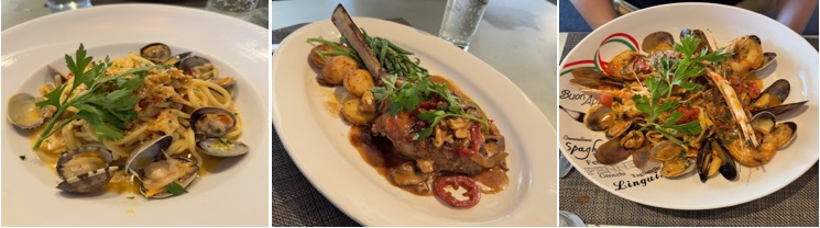 メインはその日のスペシャルのシーフードパスタにいつものボンゴレ、そして仔牛のステーキです。ボンゴレは毎回オーダーするのですが、バスタがホームメイドのブカティーニなので、ソースがしっかり絡まっている絶品です。ですが、この日のスペシャル、シーフードバスタは手長エビやチェリートマトも入って、大正解でした。ステーキはもちろんの事、温野菜の添えもそれぞれ、しっかりとした味で個性を主張しています。