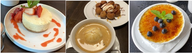 写真でご紹介するのはブランチの、特大ビーツ、取れたてルッコラ、MA州のGreat Hillブルーチーズに砂糖漬け金柑がアクセントの”Heirloom Beet+Arugula Salad”、アンチョビが隠し味のイタリア料理”Eggs in Purgatory”、ブリオッシュにアンガスビーフをむ”Samburger”、白ワイン蒸しムール貝、世界一と言われるノルウェーのFaroe Islandサーモンがおしゃれに変身した”Pistachio-Basil Crusted Salmon”、CT州の限定生産Longfordアイスクリームにエスプレッソを注いだ”Affogato”、Longfordアイスクリームをミニドーナツが囲んだ”Warm Cinnamon Sugar Donuts Holes”、”Vanilla Bean Cheesecake”苺コンポート添え、”Brown Sugar Creme Brulee”黄桃コンポート入りです。バーメニューにあるLIのWolffer Estate Vineyard産ワイン”Summer in a Bottle”のカラフェが夏の水差しとして出てきたのは粋でした。