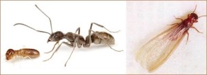 シロアリは家の土台や柱などの腐っているところを食い荒らし、家にとっては大敵ですので直ぐに駆除しなければなりません、シロアリを見かけたらすぐに大家さんに連絡しましょう。大家さんが対処します。ところでシロアリとアリの違いをご存じですか? 写真のように頭、胴、尻の3つにわかれているのが蟻で、頭、尻の2つに分かれて白っぽければシロアリです。羽根つきの種類もいます。
